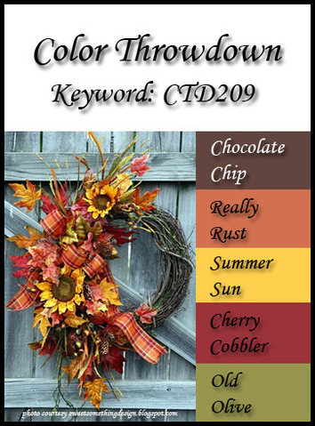 Hello there! It's Lynn, and I'll be your hostess for this week's Color Throwdown Challenge #209! I don't know about you but fall is my favorite time of year, with the cool crisp air, warm sweaters, colorful leaves, the cider mill and so much more, so the colors I chose for this week's challenge are warm fall colors. I found this terrific wreath picture on the Internet for our inspiration, I really liked all the different textures within the picture, everything from the woodgrain of the fence, the leaves & sunflowers to the grapevine of the wreath.